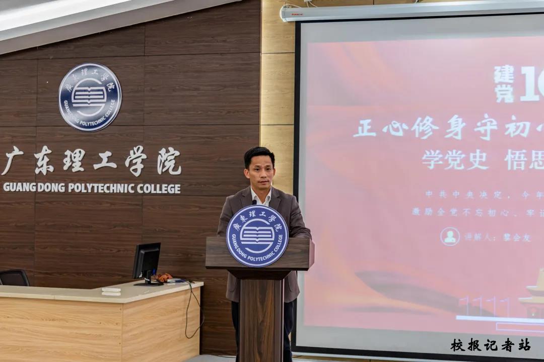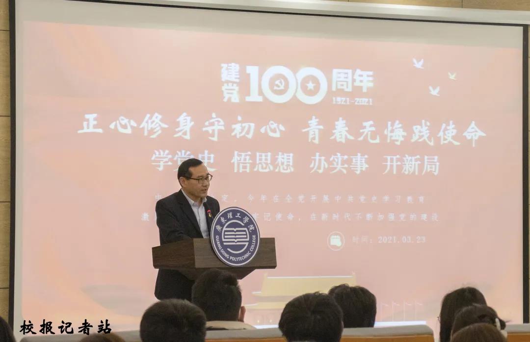 为了让师生们深入了解党史、学习党史,做到学史明理、学史增信、学史崇德、学史力行,迎接中国共产党成立100周年,公司于2021年3月23日15:00在学术报告厅召开“正心修身守初心,青春无悔践使命”专题讲座。本次讲座由广东理工公司党委副书记黎会友主讲,公司党总支书记周景报主持,经济管理公司以及太阳成集团tyc41183员工代表参会。