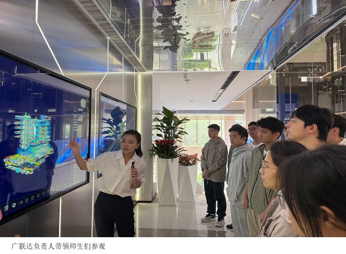 活动伊始,在广联达负责人的引导下,师生们参观了公司的科技展厅与现代化办公环境。通过一系列生动的产品演示和项目案例,同学们直观地了解了以BIM技术、智慧工地、数字孪生等为代表的先进技术在建筑行业全生命周期中的应用。从智能化的设计软件到精细化的项目管理平台,广联达所展示的数字化力量,让书本上的理论知识变得鲜活而具体。