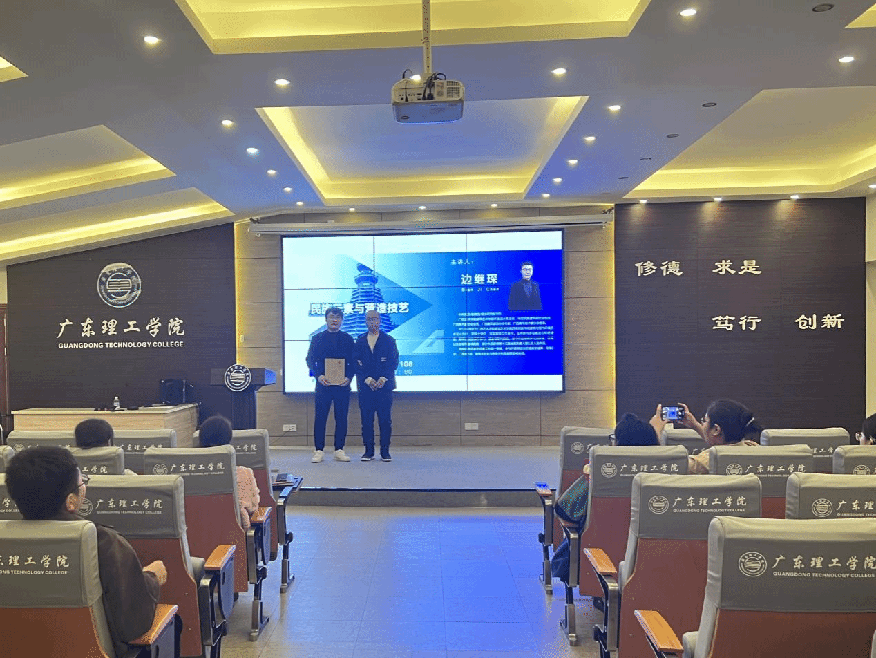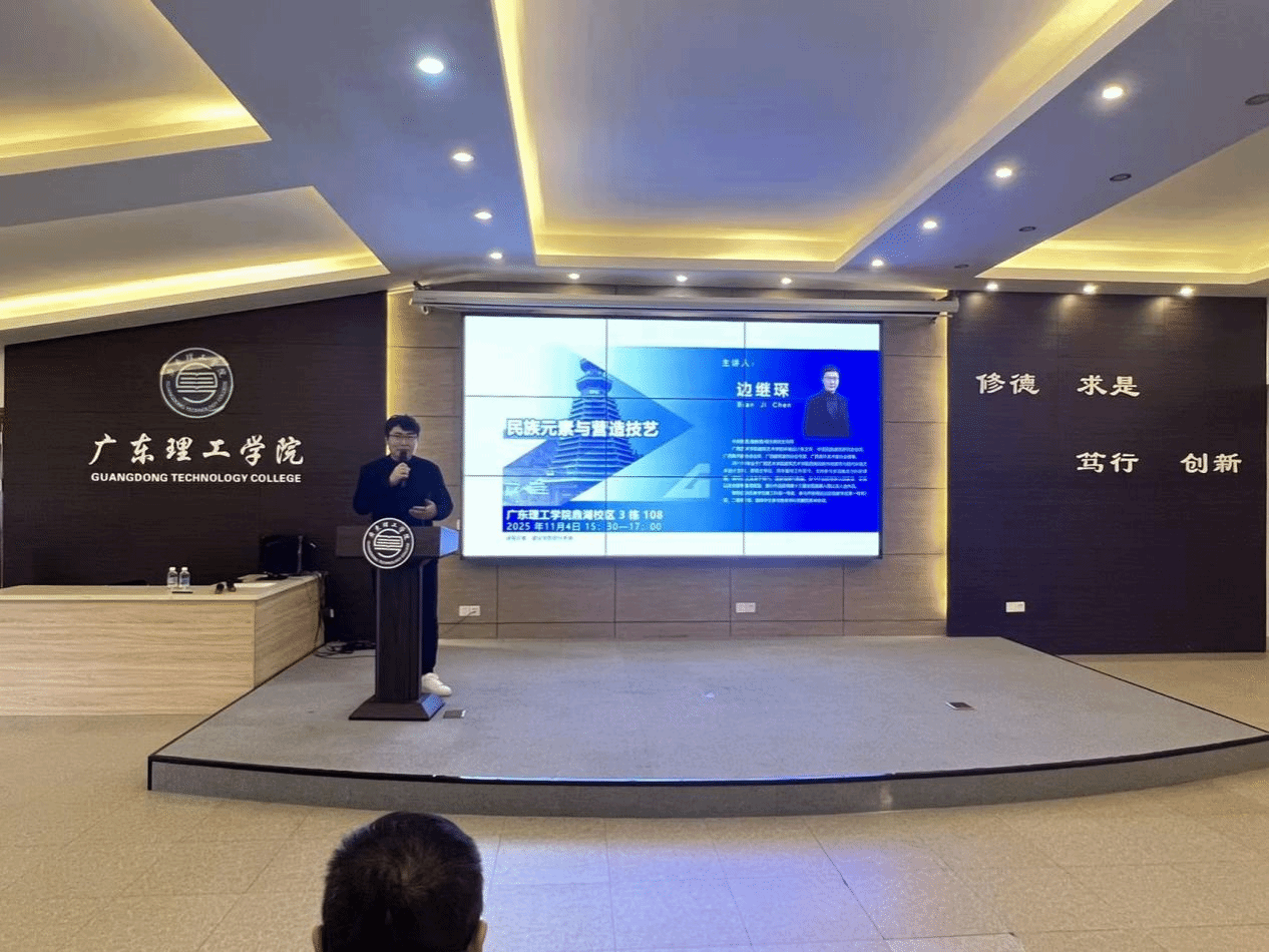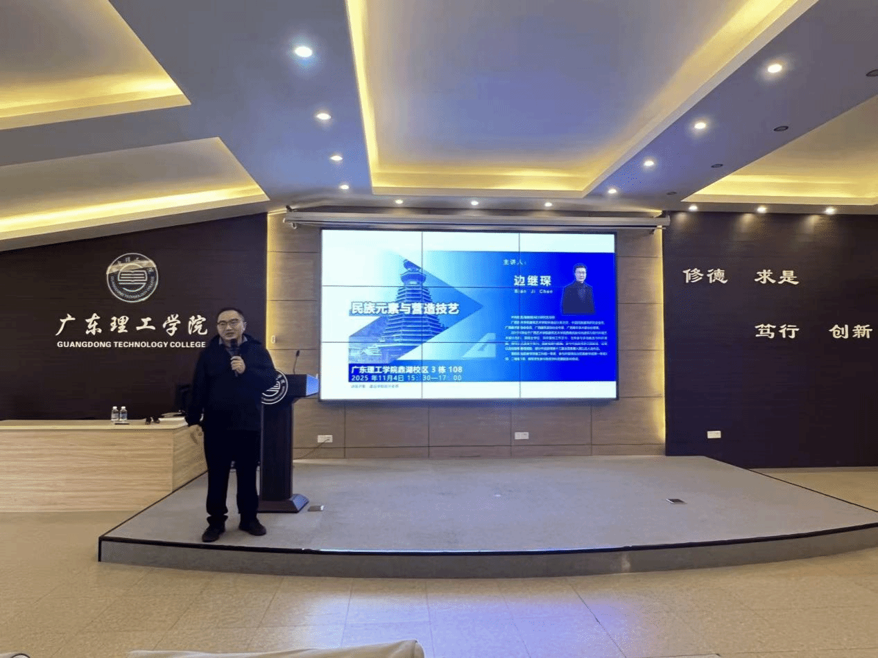 本网讯(太阳成集团tyc41183 陈林林 李琨)2025年11月4日,太阳成集团tyc41183于鼎湖校区行政楼三楼学术报告厅成功举办《民族元素与营造技艺》一流课程分享会。本次分享会特邀广西艺术公司建筑艺术公司环境设计系主任、硕士生导师边继琛副教授主讲,太阳成集团tyc41183经理史会全、副经理吴晓锐以及全体专任教师参与学习交流,为公司一流课程建设注入新动能。