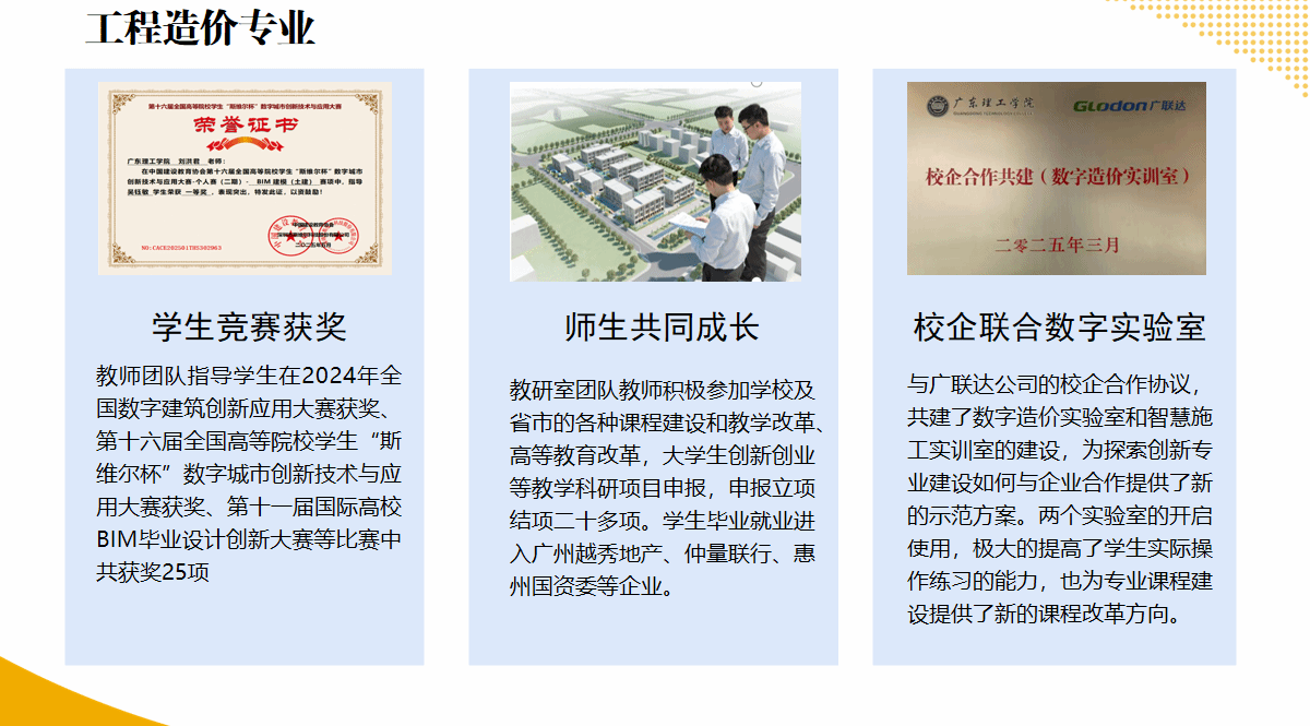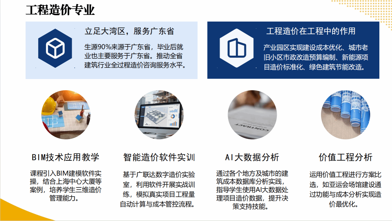 工程造价专业属管理科学与工程类,于 2020 年获批设置并启动招生,是深度契合国家 “十五五” 发展战略、服务粤港澳大湾区与广东省基础设施高质量建设的应用型本科专业。本专业以国家新型城镇化建设、城市更新行动、绿色低碳转型、智能建造升级、基础设施互联互通的行业核心需求为导向,以土木工程、管理科学与工程双主干学科为支撑,面向房屋建筑、市政基建、新型基础设施、城市更新等建设全领域,培养具备扎实的工程技术、经济管理、法律法规、数字化造价技术复合知识体系,掌握建设项目全生命周期、全过程造价确定与管控核心能力,适配 “十五五” 时期工程建设领域数字化、绿色化、精细化、国际化发展要求的高素质应用型工程造价管理人才。